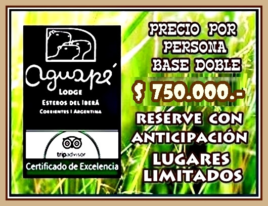 El programa incluye: Bus ida y vuelta desde Retiro. 03 días – 02 noches “CON PENSIÓN COMPLETA” en la “POSADA AGUAPÉ LODGE” con piscina, a orillas de la Laguna Iberá. Con early check-in y late check-out. La Posada Aguapé Lodge recibió “Certificado de Excelencia” de Tripadvisor y es la más acreditada del lugar. Es la única con muelle propio, desde donde salimos con las lanchas de la propia posada para las excursiones, sin tener que trasladarnos al Camping Municipal. Traslados In – Out a la localidad de Carlos Pellegrini. Guia- Coordinador Charla Introductoria de Reserva Iberá y actividades.