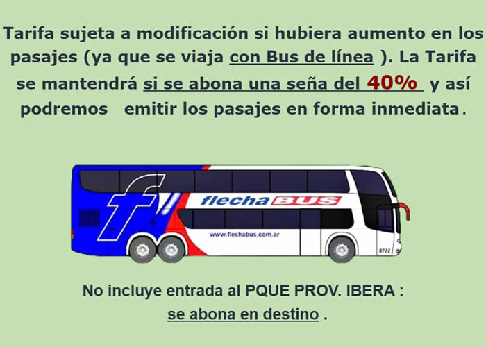 Se sale el día JUEVES 30/10/25 a las 21.00 hs. desde Retiro y se regresa desde Mercedes – Pcia. de Corrientes el DOMINGO 02 de NOVIEMBRE a las 23.00 hs., llegando a Bs. As. el 03 de NOVIEMBRE a las 07.00hs. a.m